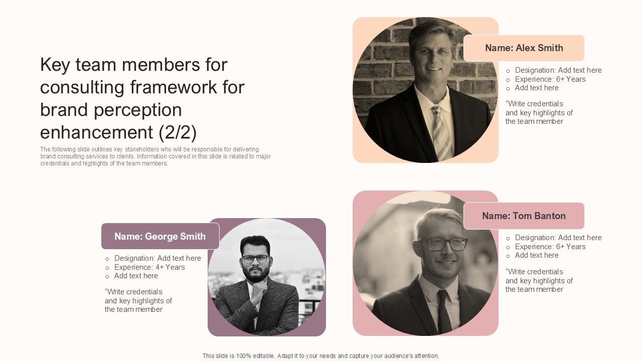 The following slide outlines key stakeholders who will be responsible for delivering brand consulting services to clients. Information covered in this slide is related to major credentials and highlights of the team members. Present like a pro with Key Team Members For Consulting Framework For Brand Perception Enhancement Topics PDF Create beautiful presentations together with your team, using our easy to use presentation slides. Share your ideas in real time and make changes on the fly by downloading our templates. So whether you are in the office, on the go, or in a remote location, you can stay in sync with your team and present your ideas with confidence. With Slidegeeks presentation got a whole lot easier. Grab these presentations today.