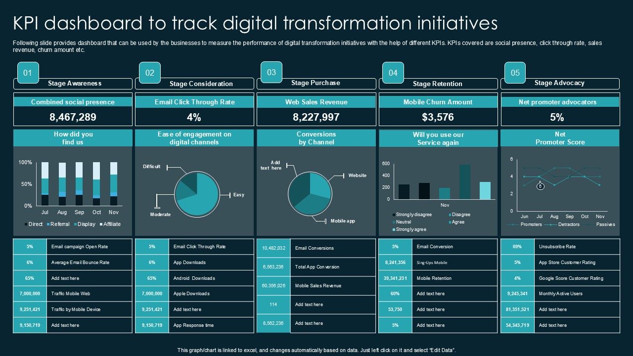 Following slide provides dashboard that can be used by the businesses to measure the performance of digital transformation initiatives with the help of different KPIs. KPIs covered are social presence, click through rate, sales revenue, churn amount etc. Crafting an eye catching presentation has never been more straightforward. Let your presentation shine with this tasteful yet straightforward Kpi Dashboard To Track Digital Transformation Initiatives Formats PDF template. It offers a minimalistic and classy look that is great for making a statement. The colors have been employed intelligently to add a bit of playfulness while still remaining professional. Construct the ideal Kpi Dashboard To Track Digital Transformation Initiatives Formats PDF that effortlessly grabs the attention of your audience Begin now and be certain to wow your customers.