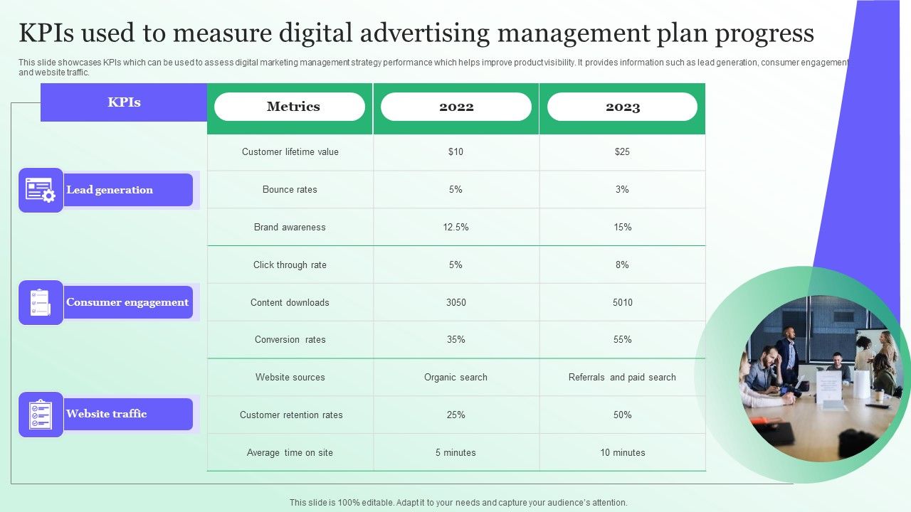 This slide showcases KPIs which can be used to assess digital marketing management strategy performance which helps improve product visibility. It provides information such as lead generation, consumer engagement and website traffic. Persuade your audience using this Kpis Used To Measure Digital Advertising Management Plan Progress Template PDF. This PPT design covers one stages, thus making it a great tool to use. It also caters to a variety of topics including Lead Generation, Consumer Engagement, Website Traffic. Download this PPT design now to present a convincing pitch that not only emphasizes the topic but also showcases your presentation skills.