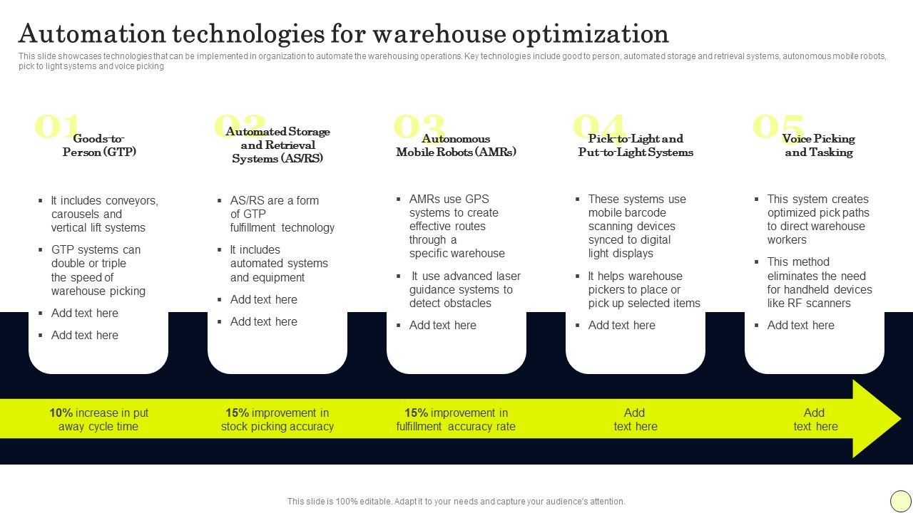This slide showcases technologies that can be implemented in organization to automate the warehousing operations. Key technologies include good to person, automated storage and retrieval systems, autonomous mobile robots, pick to light systems and voice picking. If you are looking for a format to display your unique thoughts, then the professionally designed Automation Technologies For Warehouse Optimization Structure PDF is the one for you. You can use it as a Google Slides template or a PowerPoint template. Incorporate impressive visuals, symbols, images, and other charts. Modify or reorganize the text boxes as you desire. Experiment with shade schemes and font pairings. Alter, share or cooperate with other people on your work. Download Automation Technologies For Warehouse Optimization Structure PDF and find out how to give a successful presentation. Present a perfect display to your team and make your presentation unforgettable.
