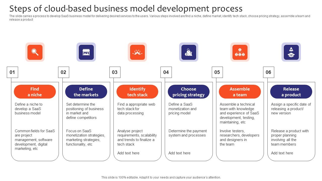 The slide carries a process to develop SaaS business model for delivering desired services to the users. Various steps involved are find a niche, define market, identify tech stack, choose pricing strategy, assemble a team and release a product. Persuade your audience using this Steps Of Cloud Based Business Model Development Process Infographics PDF. This PPT design covers six stages, thus making it a great tool to use. It also caters to a variety of topics including Find A Niche, Define The Markets, Identify Tech Stack, Choose Pricing Strategy, Assemble A Team, Release A Product. Download this PPT design now to present a convincing pitch that not only emphasizes the topic but also showcases your presentation skills.