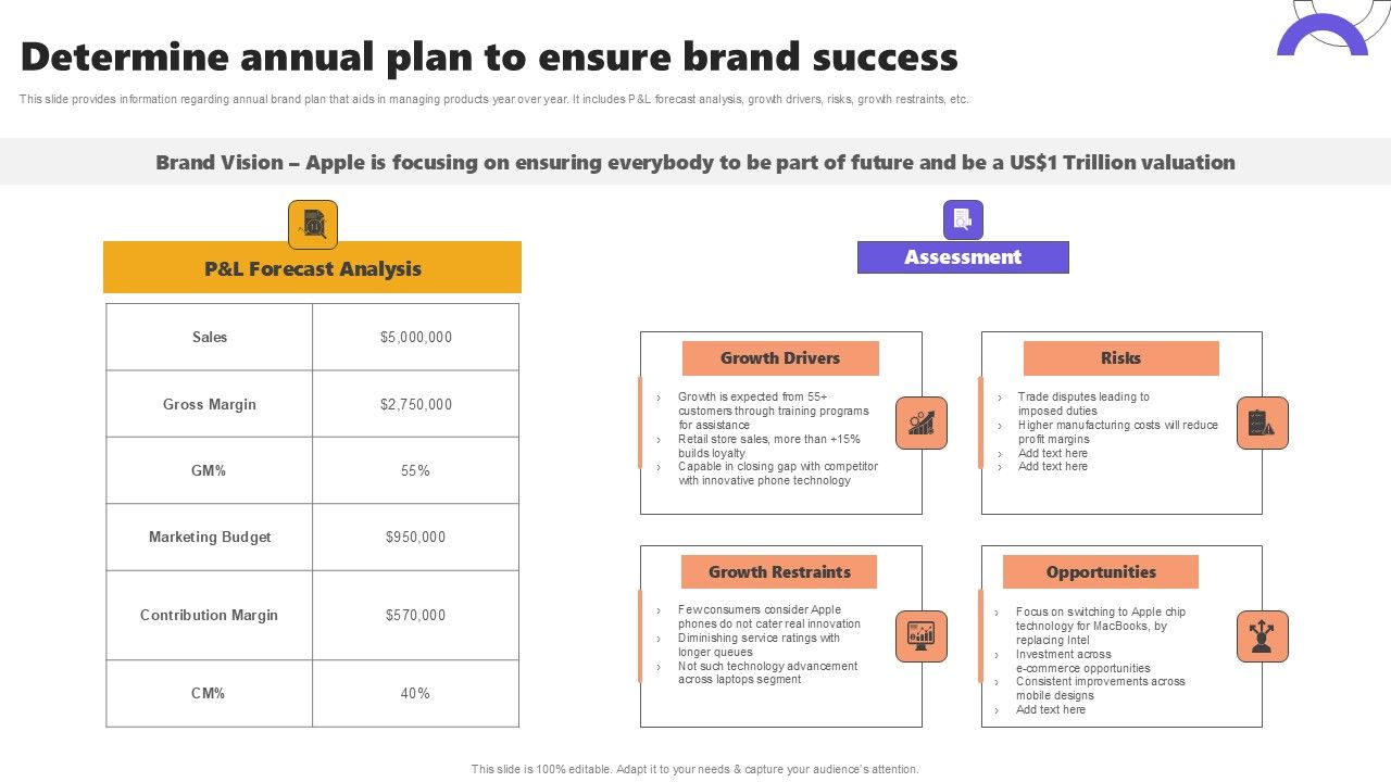 This slide provides information regarding annual brand plan that aids in managing products year over year. It includes P and L forecast analysis, growth drivers, risks, growth restraints, etc. Take your projects to the next level with our ultimate collection of Determine Annual Plan To Ensure Brand Success Ppt File Introduction PDF. Slidegeeks has designed a range of layouts that are perfect for representing task or activity duration, keeping track of all your deadlines at a glance. Tailor these designs to your exact needs and give them a truly corporate look with your own brand colors they will make your projects stand out from the rest.