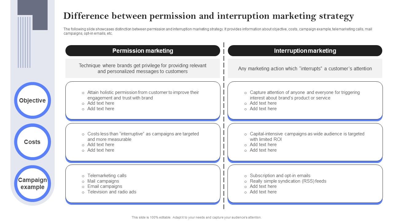 The following slide showcases distinction between permission and interruption marketing strategy. It provides information about objective, costs, campaign example, telemarketing calls, mail campaigns, opt-in emails, etc. There are so many reasons you need a Difference Between Permission And Interruption Marketing Strategy Microsoft PDF. The first reason is you can not spend time making everything from scratch, Thus, Slidegeeks has made presentation templates for you too. You can easily download these templates from our website easily.