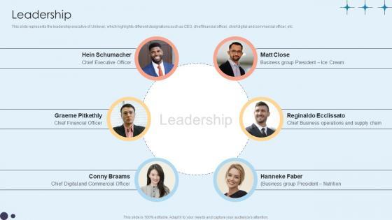 This slide represents the leadership executive of Unilever, which highlights different designations such as CEO, chief financial officer, chief digital and commercial officer, etc.The Leadership Home Care Solutions Company Profile CP SS V is a compilation of the most recent design trends as a series of slides. It is suitable for any subject or industry presentation, containing attractive visuals and photo spots for businesses to clearly express their messages. This template contains a variety of slides for the user to input data, such as structures to contrast two elements, bullet points, and slides for written information. Slidegeeks is prepared to create an impression.