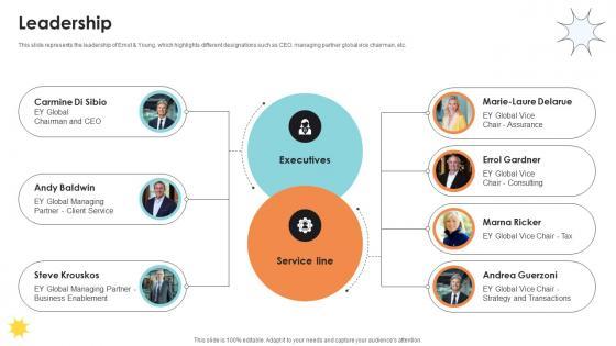 This slide represents the leadership of Ernst and Young, which highlights different designations such as CEO, managing partner global vice chairman, etc.If your project calls for a presentation, then Slidegeeks is your go-to partner because we have professionally designed, easy-to-edit templates that are perfect for any presentation. After downloading, you can easily edit Leadership Professional Services And Tax Advisory Company Profile CP SS V and make the changes accordingly. You can rearrange slides or fill them with different images. Check out all the handy templates