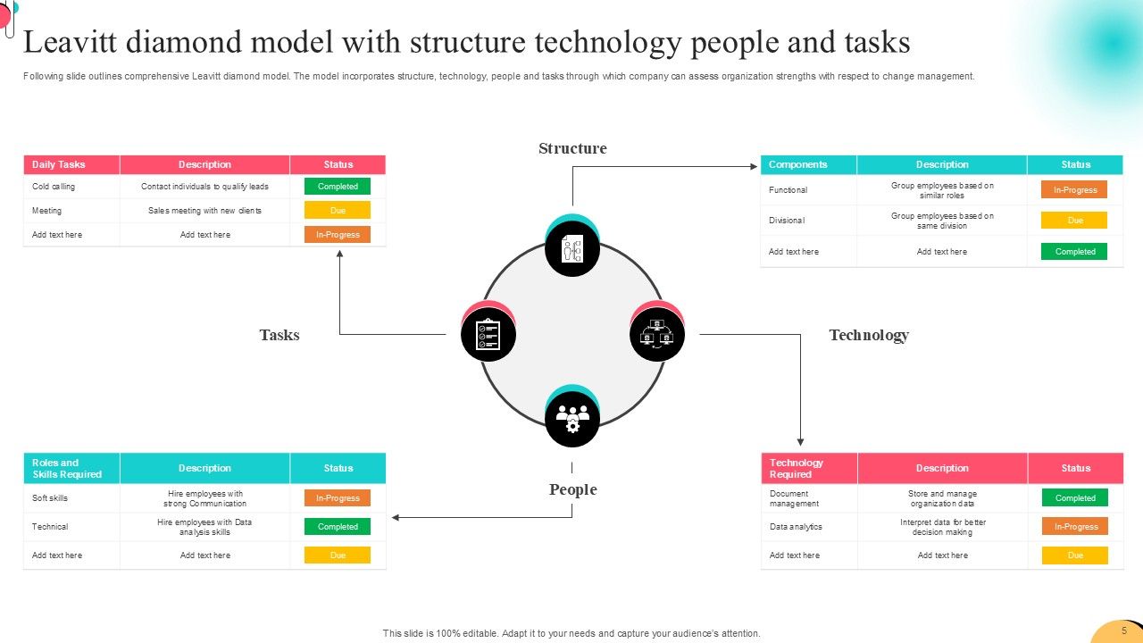 Improve your presentation delivery using this Leavitts Diamond Model Ppt PowerPoint Presentation Complete Deck With Slides. Support your business vision and objectives using this well-structured PPT deck. This template offers a great starting point for delivering beautifully designed presentations on the topic of your choice. Comprising nine this professionally designed template is all you need to host discussion and meetings with collaborators. Each slide is self-explanatory and equipped with high-quality graphics that can be adjusted to your needs. Therefore, you will face no difficulty in portraying your desired content using this PPT slideshow. This PowerPoint slideshow contains every important element that you need for a great pitch. It is not only editable but also available for immediate download and utilization. The color, font size, background, shapes everything can be modified to create your unique presentation layout. Therefore, download it now.