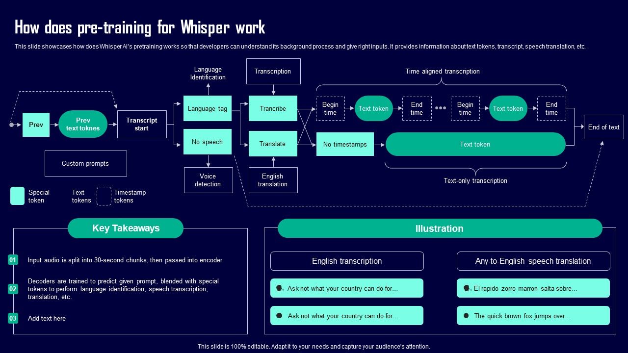 This slide showcases how does Whisper AIs pretraining works so that developers can understand its background process and give right inputs. It provides information about text tokens, transcript, speech translation, etc. Coming up with a presentation necessitates that the majority of the effort goes into the content and the message you intend to convey. The visuals of a PowerPoint presentation can only be effective if it supplements and supports the story that is being told. Keeping this in mind our experts created Leveraging Openai API For Business How Does Pre Training For Whisper Work Portrait PDF to reduce the time that goes into designing the presentation. This way, you can concentrate on the message while our designers take care of providing you with the right template for the situation.