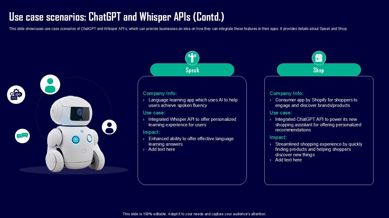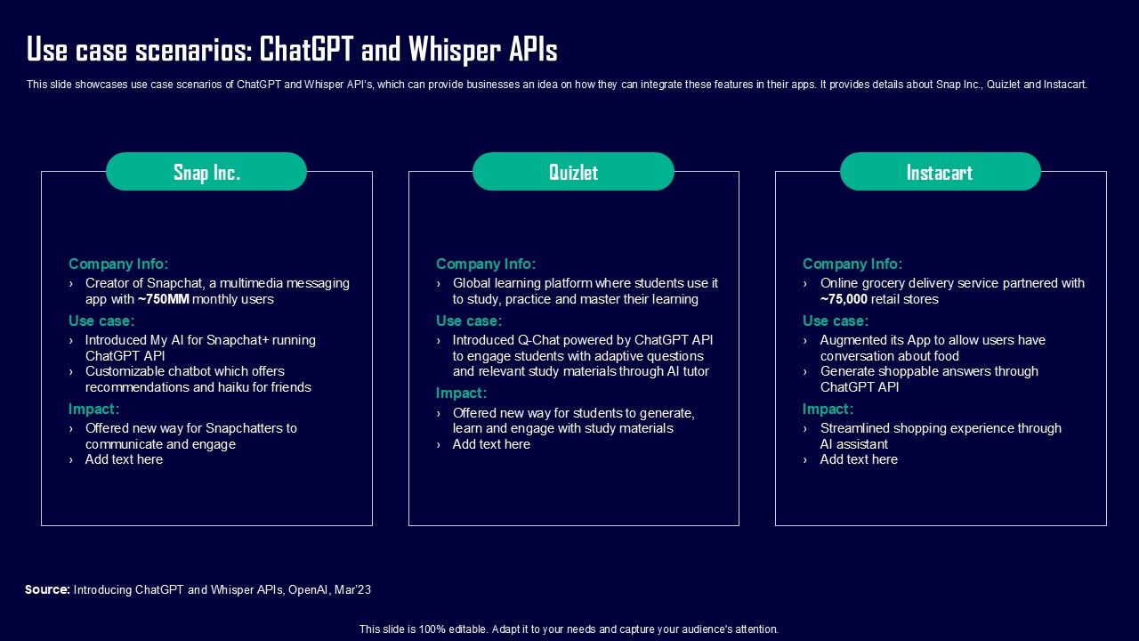 This slide showcases use case scenarios of ChatGPT and Whisper APIs, which can provide businesses an idea on how they can integrate these features in their apps. It provides details about Snap Inc., Quizlet and Instacart. Get a simple yet stunning designed Leveraging Openai API For Business Use Case Scenarios Chatgpt And Whisper Apis Mockup PDF. It is the best one to establish the tone in your meetings. It is an excellent way to make your presentations highly effective. So, download this PPT today from Slidegeeks and see the positive impacts. Our easy to edit Leveraging Openai API For Business Use Case Scenarios Chatgpt And Whisper Apis Mockup PDF can be your go to option for all upcoming conferences and meetings. So, what are you waiting for Grab this template today.