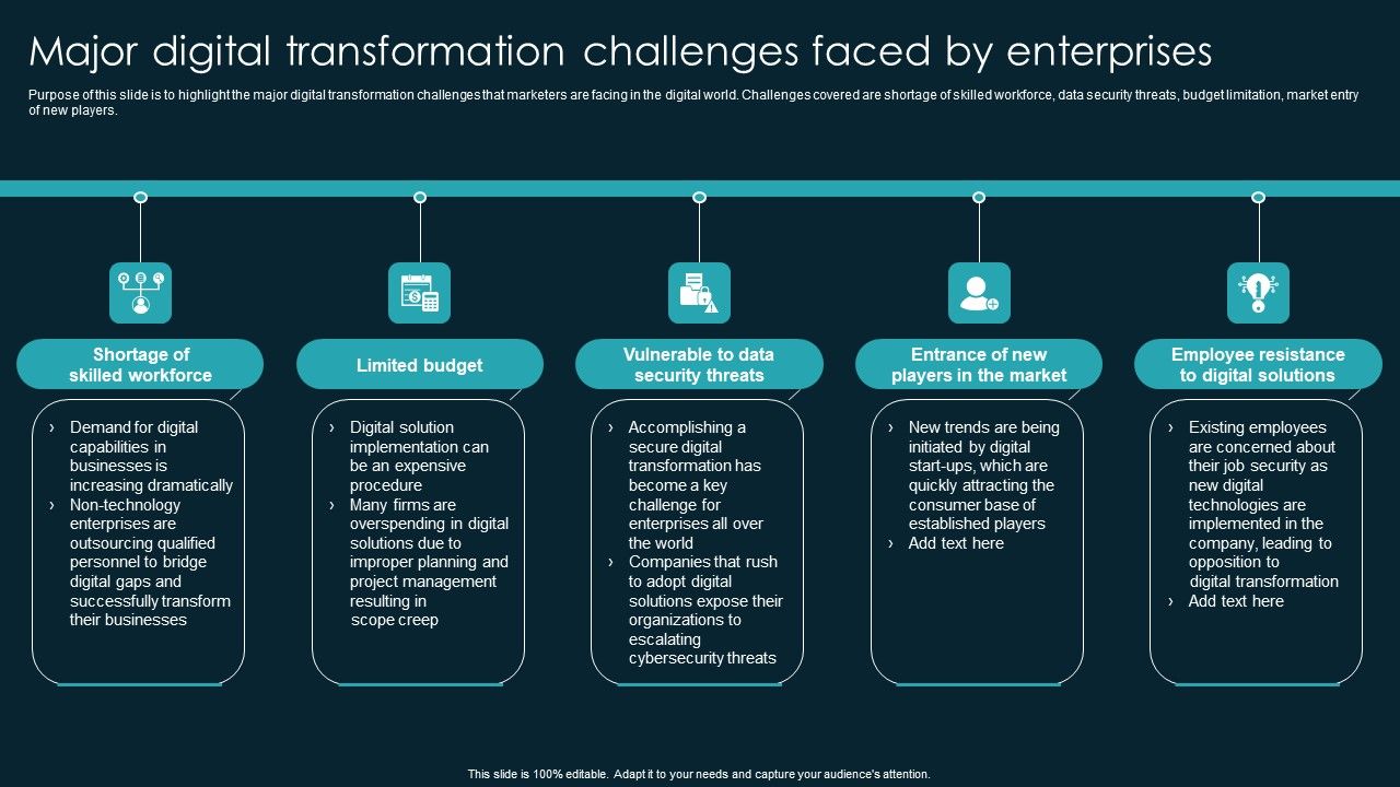 Purpose of this slide is to highlight the major digital transformation challenges that marketers are facing in the digital world. Challenges covered are shortage of skilled workforce, data security threats, budget limitation, market entry of new players. Slidegeeks has constructed Major Digital Transformation Challenges Faced By Enterprises Diagrams PDF after conducting extensive research and examination. These presentation templates are constantly being generated and modified based on user preferences and critiques from editors. Here, you will find the most attractive templates for a range of purposes while taking into account ratings and remarks from users regarding the content. This is an excellent jumping off point to explore our content and will give new users an insight into our top notch PowerPoint Templates.