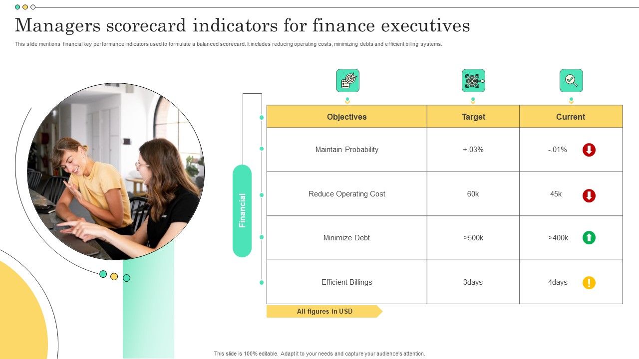 This slide mentions financial key performance indicators used to formulate a balanced scorecard. It includes reducing operating costs, minimizing debts and efficient billing systems. Presenting Managers Scorecard Indicators For Finance Executives Topics PDF to dispense important information. This template comprises three stages. It also presents valuable insights into the topics including Executives, Managers, Finance. This is a completely customizable PowerPoint theme that can be put to use immediately. So, download it and address the topic impactfully.