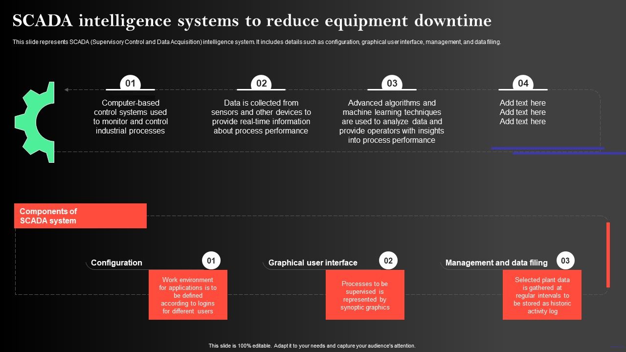 This slide represents SCADA Supervisory Control and Data Acquisition intelligence system. It includes details such as configuration, graphical user interface, management, and data filing. There are so many reasons you need a Manufacturing Operations Management Process Scada Intelligence Systems To Reduce Guidelines PDF. The first reason is you can not spend time making everything from scratch, Thus, Slidegeeks has made presentation templates for you too. You can easily download these templates from our website easily.