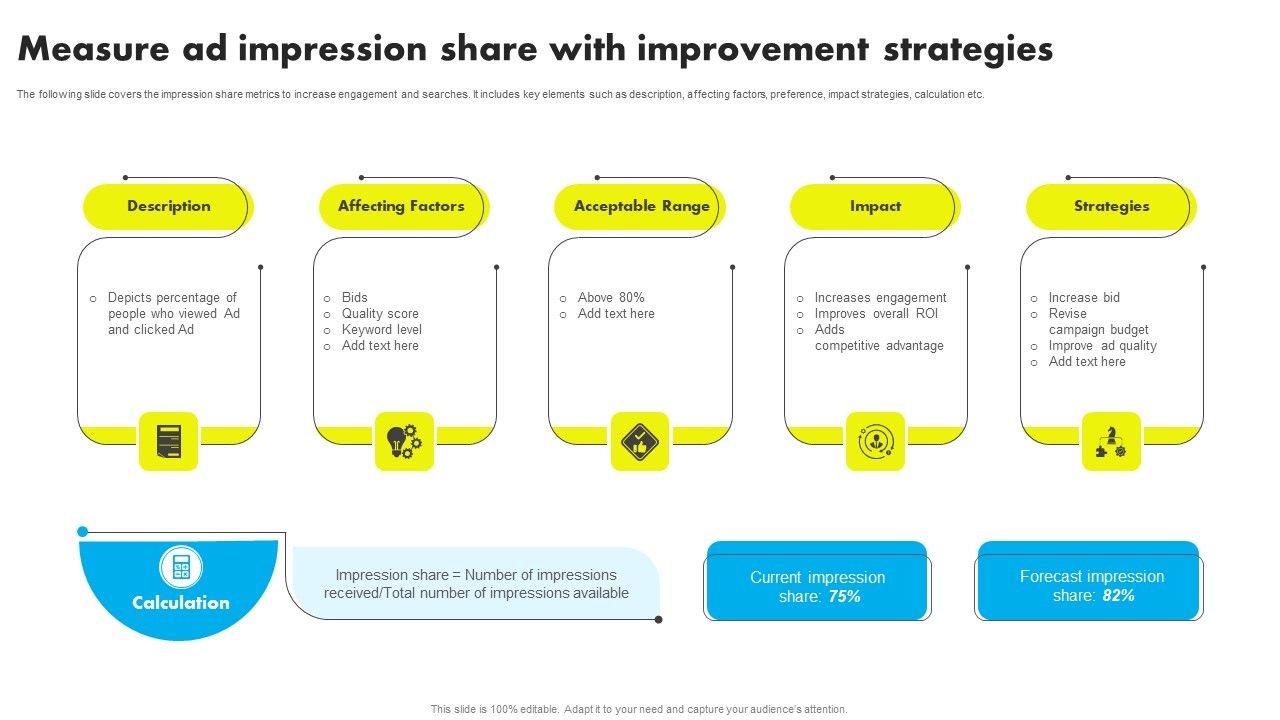 The following slide covers the impression share metrics to increase engagement and searches. It includes key elements such as description, affecting factors, preference, impact strategies, calculation etc. Welcome to our selection of the Measure Ad Impression Share With Improvement Strategies Ppt Summary Picture PDF. These are designed to help you showcase your creativity and bring your sphere to life. Planning and Innovation are essential for any business that is just starting out. This collection contains the designs that you need for your everyday presentations. All of our PowerPoints are 100 percent editable, so you can customize them to suit your needs. This multi purpose template can be used in various situations. Grab these presentation templates today.