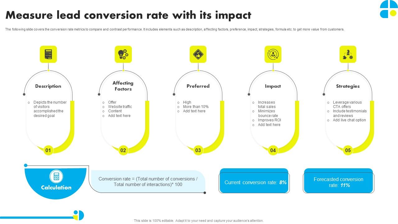 The following slide covers the conversion rate metrics to compare and contrast performance. It includes elements such as description, affecting factors, preference, impact, strategies, formula etc. to get more value from customers. The best PPT templates are a great way to save time, energy, and resources. Slidegeeks have 100 percent editable powerpoint slides making them incredibly versatile. With these quality presentation templates, you can create a captivating and memorable presentation by combining visually appealing slides and effectively communicating your message. Download Measure Lead Conversion Rate With Its Impact Ppt Portfolio Example PDF from Slidegeeks and deliver a wonderful presentation.