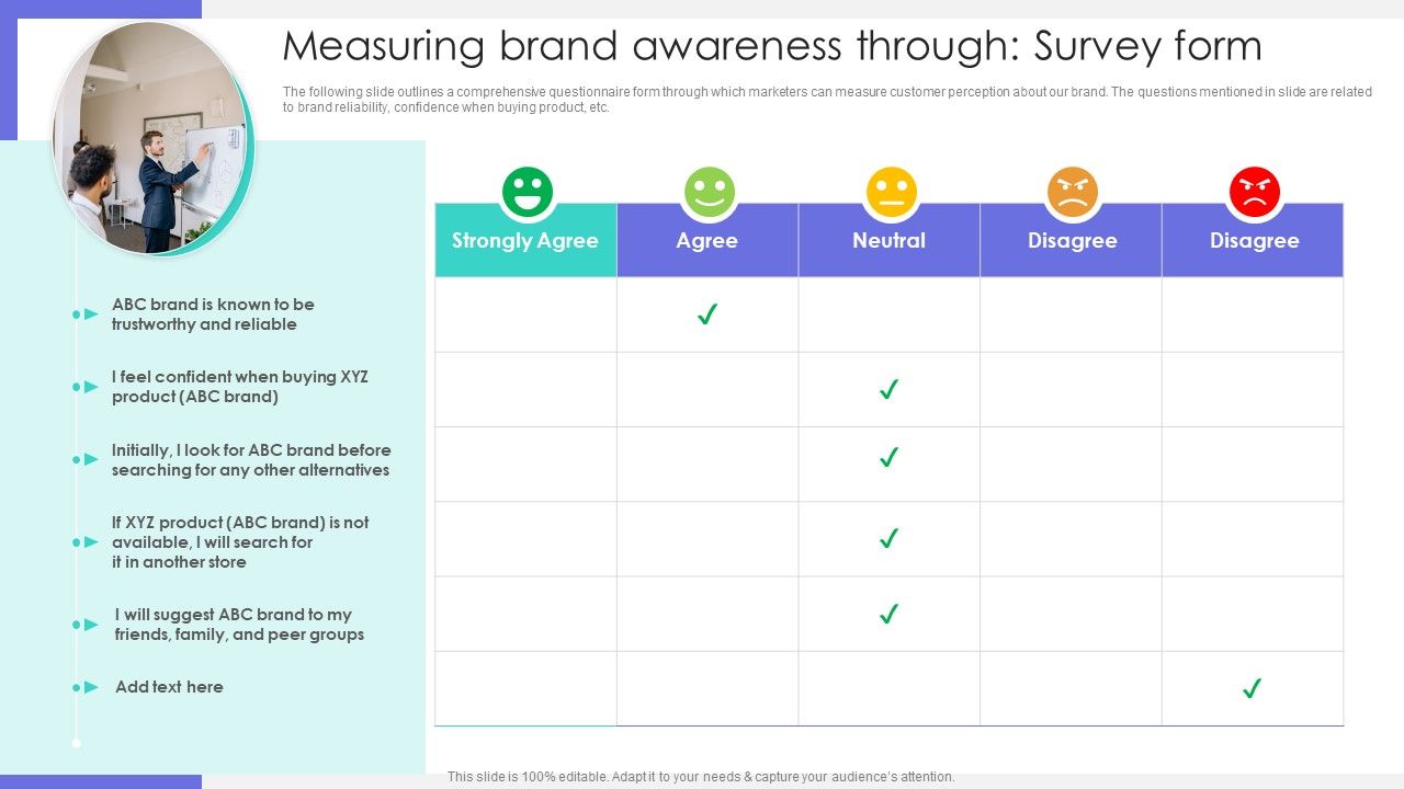 The following slide outlines a comprehensive questionnaire form through which marketers can measure customer perception about our brand. The questions mentioned in slide are related to brand reliability, confidence when buying product, etc. Are you searching for a Measuring Brand Awareness Through Survey Form Ppt Gallery Deck PDF that is uncluttered, straightforward, and original Its easy to edit, and you can change the colors to suit your personal or business branding. For a presentation that expresses how much effort you have put in, this template is ideal With all of its features, including tables, diagrams, statistics, and lists, its perfect for a business plan presentation. Make your ideas more appealing with these professional slides. Download Measuring Brand Awareness Through Survey Form Ppt Gallery Deck PDF from Slidegeeks today.