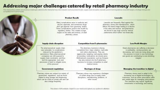 This slide portrays details about various challenges catered by the retail pharmacy store industry such as product recalls, supply chain disruption, lawsuits, government regulations, low profit margins, shortage of drugs and competition from Epharmacies Find a pre designed and impeccable Addressing Major Challenges Catered Pharmacy Business Plan Go To Market Strategy Infographics Pdf. The templates can ace your presentation without additional effort. You can download these easy to edit presentation templates to make your presentation stand out from others. So, what are you waiting for Download the template from Slidegeeks today and give a unique touch to your presentation.