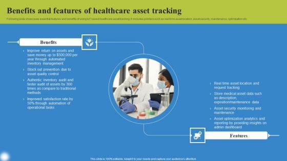 Following slide showcases essential features and benefits of using IoT based healthcare asset tracking. It includes pointers such as real time asset location, asset security, maintenance, optimization etc. Crafting an eye catching presentation has never been more straightforward. Let your presentation shine with this tasteful yet straightforward Benefits And Features Of Healthcare Deploying IoT Solutions For Enhanced Healthcare Microsoft Pdf template. It offers a minimalistic and classy look that is great for making a statement. The colors have been employed intelligently to add a bit of playfulness while still remaining professional. Construct the ideal Benefits And Features Of Healthcare Deploying IoT Solutions For Enhanced Healthcare Microsoft Pdf that effortlessly grabs the attention of your audience Begin now and be certain to wow your customers