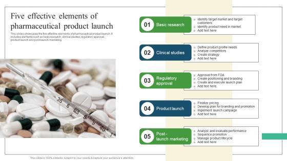 This slides showcases the five effective elements of pharmaceutical product launch. It includes elements such as basic research, clinical studies, regulatory approval, product launch and post launch marketing. Make sure to capture your audiences attention in your business displays with our gratis customizable Five Effective Elements Pharmaceutical Promotional Strategies To Drive Business Sales Portrait Pdf. These are great for business strategies, office conferences, capital raising or task suggestions. If you desire to acquire more customers for your tech business and ensure they stay satisfied, create your own sales presentation with these plain slides.