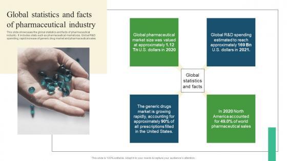 This slide showcases the global statistics and facts of pharmaceutical industry. It includes stats such as pharmaceutical market size, Global RandD spending, rapid increase of generic drug market and pharmaceutical sales. Coming up with a presentation necessitates that the majority of the effort goes into the content and the message you intend to convey. The visuals of a PowerPoint presentation can only be effective if it supplements and supports the story that is being told. Keeping this in mind our experts created Global Statistics And Facts Pharmaceutical Promotional Strategies To Drive Business Sales Portrait Pdf to reduce the time that goes into designing the presentation. This way, you can concentrate on the message while our designers take care of providing you with the right template for the situation.