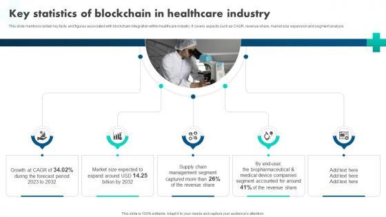 This slide mentions certain key facts and figures associated with blockchain integration within healthcare industry. It covers aspects such as CAGR, revenue share, market size expansion and segment analysis. Slidegeeks is one of the best resources for PowerPoint templates. You can download easily and regulate How Blockchain Is Reshaping Key Statistics Of Blockchain In Healthcare Industry BCT SS V for your personal presentations from our wonderful collection. A few clicks is all it takes to discover and get the most relevant and appropriate templates. Use our Templates to add a unique zing and appeal to your presentation and meetings. All the slides are easy to edit and you can use them even for advertisement purposes.