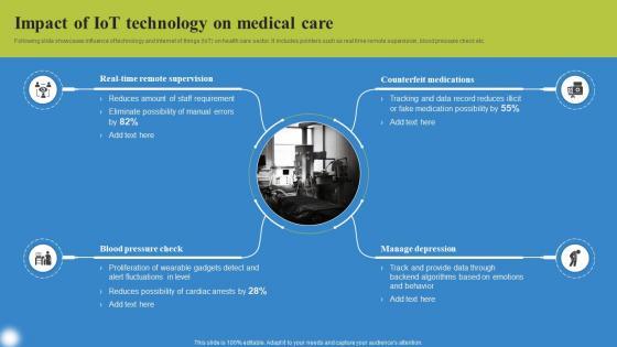 Following slide showcases influence of technology and internet of things IoT on health care sector. It includes pointers such as real time remote supervision, blood pressure check etc. Boost your pitch with our creative Impact Of IoT Technology Deploying IoT Solutions For Enhanced Healthcare Brochure Pdf. Deliver an awe inspiring pitch that will mesmerize everyone. Using these presentation templates you will surely catch everyones attention. You can browse the ppts collection on our website. We have researchers who are experts at creating the right content for the templates. So you do not have to invest time in any additional work. Just grab the template now and use them.