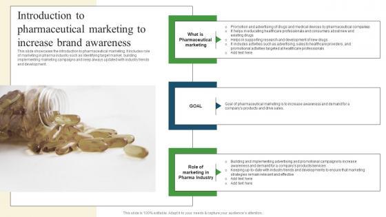 This slide showcases the introduction to pharmaceutical marketing. It includes role of marketing in pharma industry such as identifying target market, building implementing marketing campaigns and keep always updated with industry trends and development. The Introduction Pharmaceutical Marketing Pharmaceutical Promotional Strategies To Drive Business Sales Ideas Pdf is a compilation of the most recent design trends as a series of slides. It is suitable for any subject or industry presentation, containing attractive visuals and photo spots for businesses to clearly express their messages. This template contains a variety of slides for the user to input data, such as structures to contrast two elements, bullet points, and slides for written information. Slidegeeks is prepared to create an impression.