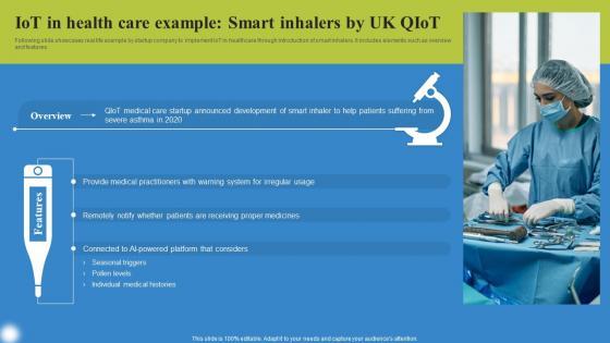 Following slide showcases real life example by startup company to implement IoT in healthcare through introduction of smart inhalers. It includes elements such as overview and features. Present like a pro with IoT In Health Care Example Smart Deploying IoT Solutions For Enhanced Healthcare Mockup Pdf Create beautiful presentations together with your team, using our easy to use presentation slides. Share your ideas in real time and make changes on the fly by downloading our templates. So whether you are in the office, on the go, or in a remote location, you can stay in sync with your team and present your ideas with confidence. With Slidegeeks presentation got a whole lot easier. Grab these presentations today.