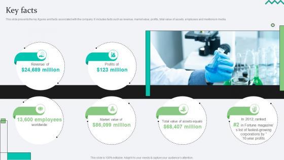 This slide presents the key figures and facts associated with the company. It includes facts such as revenue, market value, profits, total value of assets, employees and mentions in media. If your project calls for a presentation, then Slidegeeks is your go-to partner because we have professionally designed, easy-to-edit templates that are perfect for any presentation. After downloading, you can easily edit Key Facts Biopharma Research Organization Pitch Deck and make the changes accordingly. You can rearrange slides or fill them with different images. Check out all the handy templates