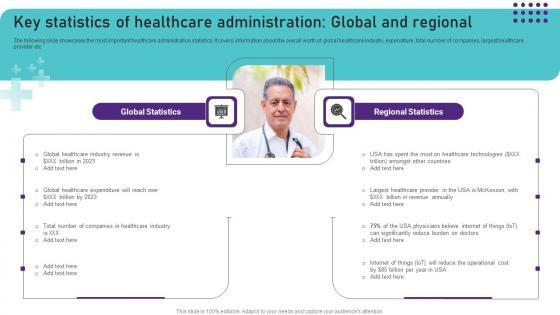 The Key Statistics Of Healthcare Administration Global Operational Areas Healthcare Brochure PDF is a compilation of the most recent design trends as a series of slides. It is suitable for any subject or industry presentation, containing attractive visuals and photo spots for businesses to clearly express their messages. This template contains a variety of slides for the user to input data, such as structures to contrast two elements, bullet points, and slides for written information. Slidegeeks is prepared to create an impression.