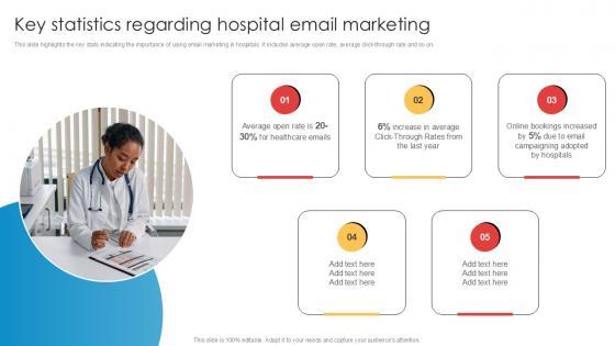 This slide highlights the key stats indicating the importance of using email marketing in hospitals. It includes average open rate, average click through rate and so on. This Key Statistics Regarding Hospital Email Marketing Implementation Of Online Ppt Template from Slidegeeks makes it easy to present information on your topic with precision. It provides customization options, so you can make changes to the colors, design, graphics, or any other component to create a unique layout. It is also available for immediate download, so you can begin using it right away. Slidegeeks has done good research to ensure that you have everything you need to make your presentation stand out. Make a name out there for a brilliant performance.