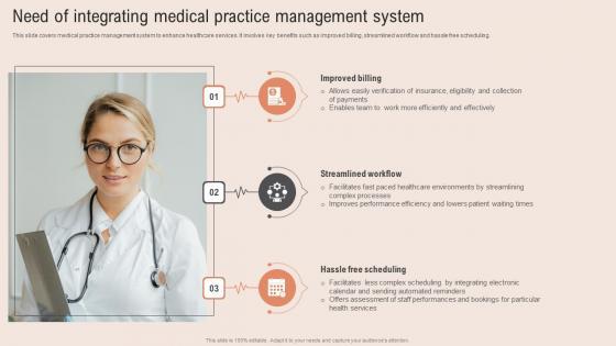 This slide covers medical practice management system to enhance healthcare services. It involves key benefits such as improved billing, streamlined workflow and hassle free scheduling. Boost your pitch with our creative Need Of Integrating Medical Healthcare Information Tech To Enhance Medical Facilities Designs Pdf. Deliver an awe inspiring pitch that will mesmerize everyone. Using these presentation templates you will surely catch everyones attention. You can browse the ppts collection on our website. We have researchers who are experts at creating the right content for the templates. So you do not have to invest time in any additional work. Just grab the template now and use them.