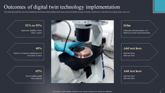 This slide represents the outcomes of digital twin technology implementation that include improved stability, savings on reactive maintenance, reduced time to achieve goals, and so on. Slidegeeks has constructed Outcomes Digital Twin Technology Industrial Transformation Using Digital Twin Diagrams Pdf after conducting extensive research and examination. These presentation templates are constantly being generated and modified based on user preferences and critiques from editors. Here, you will find the most attractive templates for a range of purposes while taking into account ratings and remarks from users regarding the content. This is an excellent jumping off point to explore our content and will give new users an insight into our top notch PowerPoint Templates.