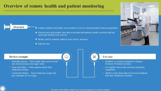 Following slide provides overview od remote health monitoring to improve medical efficiency. It includes elements such as overview, devices example and use cases. Crafting an eye catching presentation has never been more straightforward. Let your presentation shine with this tasteful yet straightforward Overview Of Remote Health Deploying IoT Solutions For Enhanced Healthcare Rules Pdf template. It offers a minimalistic and classy look that is great for making a statement. The colors have been employed intelligently to add a bit of playfulness while still remaining professional. Construct the ideal Overview Of Remote Health Deploying IoT Solutions For Enhanced Healthcare Rules Pdf that effortlessly grabs the attention of your audience Begin now and be certain to wow your customers