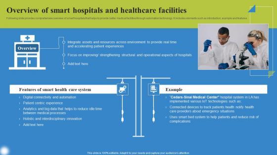 Following slide provides comprehensive overview of smart hospitals that helps to provide better medical facilities through automation technology. It includes elements such as introduction, example and features. Make sure to capture your audiences attention in your business displays with our gratis customizable Overview Of Smart Hospitals Deploying IoT Solutions For Enhanced Healthcare Brochure Pdf. These are great for business strategies, office conferences, capital raising or task suggestions. If you desire to acquire more customers for your tech business and ensure they stay satisfied, create your own sales presentation with these plain slides.