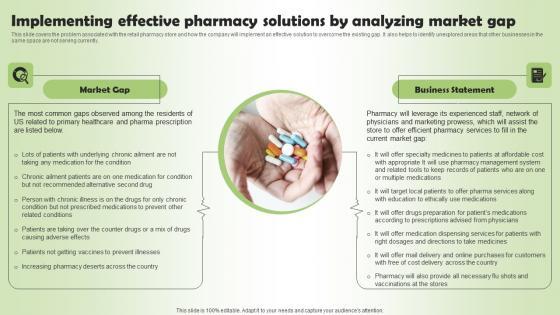 This slide covers the problem associated with the retail pharmacy store and how the company will implement an effective solution to overcome the existing gap. It also helps to identify unexplored areas that other businesses in the same space are not serving currently. The best PPT templates are a great way to save time, energy, and resources. Slidegeeks have 100 percent editable powerpoint slides making them incredibly versatile. With these quality presentation templates, you can create a captivating and memorable presentation by combining visually appealing slides and effectively communicating your message. Download Pharmacy Business Plan Go To Market Strategy Implementing Effective Pharmacy Solutions Slides Pdf from Slidegeeks and deliver a wonderful presentation.