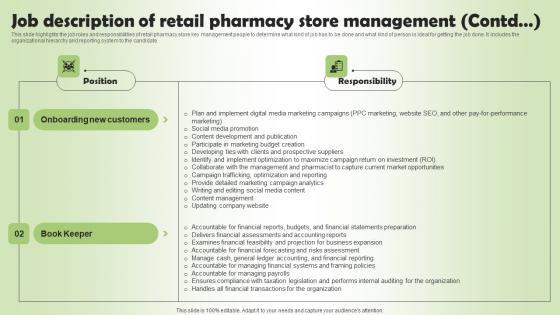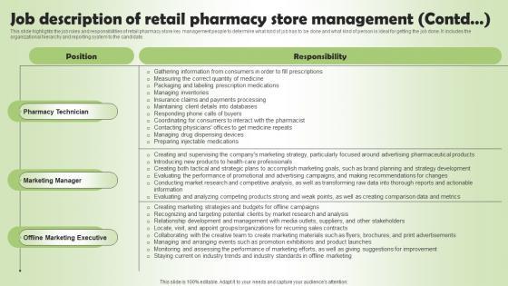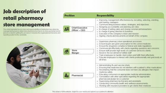 This slide highlights the job roles and responsibilities of retail pharmacy store key management people to determine what kind of job has to be done and what kind of person is ideal for getting the job done. It includes the organizational hierarchy and reporting system to the candidate. The Pharmacy Business Plan Go To Market Strategy Job Description Of Retail Pharmacy Store Brochure Pdf is a compilation of the most recent design trends as a series of slides. It is suitable for any subject or industry presentation, containing attractive visuals and photo spots for businesses to clearly express their messages. This template contains a variety of slides for the user to input data, such as structures to contrast two elements, bullet points, and slides for written information. Slidegeeks is prepared to create an impression.