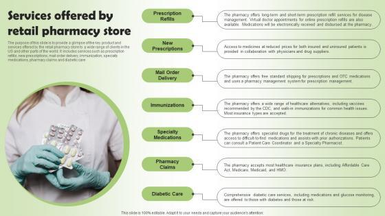 The purpose of this slide is to provide a glimpse of the key product and services offered by the retail pharmacy store to a wide range of clients in the US and other parts of the world. It includes services such as prescription refills, new prescriptions, mail order delivery, immunization, specialty medications, pharmacy claims and diabetic care Retrieve professionally designed Pharmacy Business Plan Go To Market Strategy Services Offered By Retail Pharmacy Structure Pdf to effectively convey your message and captivate your listeners. Save time by selecting pre made slideshows that are appropriate for various topics, from business to educational purposes. These themes come in many different styles, from creative to corporate, and all of them are easily adjustable and can be edited quickly. Access them as PowerPoint templates or as Google Slides themes. You do not have to go on a hunt for the perfect presentation because Slidegeeks got you covered from everywhere.