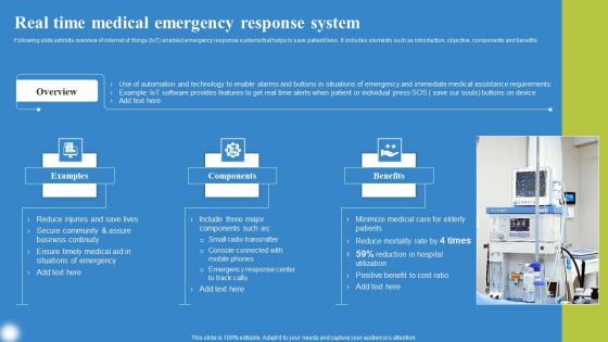 Following slide exhibits overview of internet of things IoT enabled emergency response systems that helps to save patient lives. It includes elements such as introduction, objective, components and benefits. Coming up with a presentation necessitates that the majority of the effort goes into the content and the message you intend to convey. The visuals of a PowerPoint presentation can only be effective if it supplements and supports the story that is being told. Keeping this in mind our experts created Real Time Medical Emergency Deploying IoT Solutions For Enhanced Healthcare Demonstration Pdf to reduce the time that goes into designing the presentation. This way, you can concentrate on the message while our designers take care of providing you with the right template for the situation.