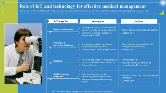 Following slide exhibits role of IoT in health care sector to improve operational efficiency. It includes role of IoT for medical professionals, patients, hospitals, health insurance companies tec. The best PPT templates are a great way to save time, energy, and resources. Slidegeeks have 100 percent editable powerpoint slides making them incredibly versatile. With these quality presentation templates, you can create a captivating and memorable presentation by combining visually appealing slides and effectively communicating your message. Download Role Of IoT And Technology For Effective Deploying IoT Solutions For Enhanced Healthcare Topics Pdf from Slidegeeks and deliver a wonderful presentation.