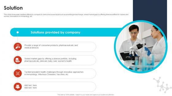 This slide showcases solutions offered by company to overcome issues faced such as providing product range, solved market gaps by offering diverse portfolio for babies and women, innovations in immunology, etc. If your project calls for a presentation, then Slidegeeks is your go-to partner because we have professionally designed, easy-to-edit templates that are perfect for any presentation. After downloading, you can easily edit Solution Pharma Industry Business Canvas Model BMC SS V and make the changes accordingly. You can rearrange slides or fill them with different images. Check out all the handy templates