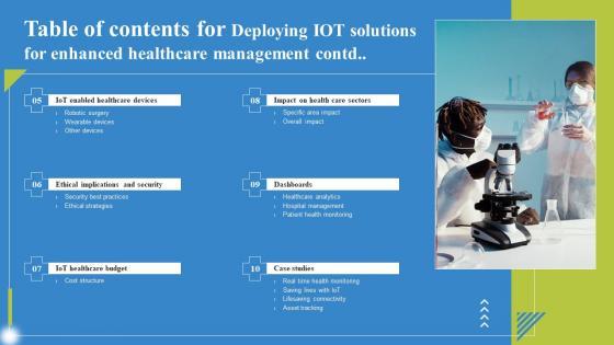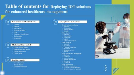 There are so many reasons you need a Table Of Contents For Deploying IoT Solutions For Enhanced Healthcare Management Elements Pdf. The first reason is you can not spend time making everything from scratch, Thus, Slidegeeks has made presentation templates for you too. You can easily download these templates from our website easily.