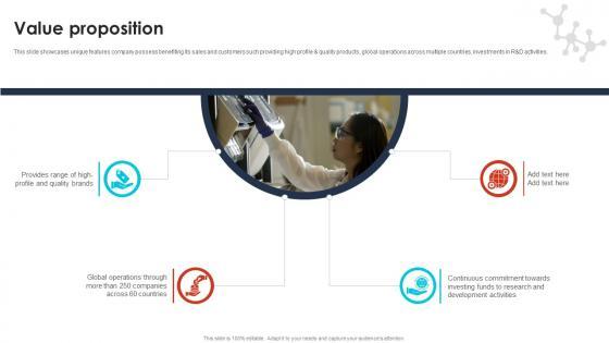 This slide showcases unique features company possess benefiting its sales and customers such providing high profile and quality products, global operations across multiple countries, investments in R and D activities. Are you in need of a template that can accommodate all of your creative concepts This one is crafted professionally and can be altered to fit any style. Use it with Google Slides or PowerPoint. Include striking photographs, symbols, depictions, and other visuals. Fill, move around, or remove text boxes as desired. Test out color palettes and font mixtures. Edit and save your work, or work with colleagues. Download Value Proposition Pharma Industry Business Canvas Model BMC SS V and observe how to make your presentation outstanding. Give an impeccable presentation to your group and make your presentation unforgettable.