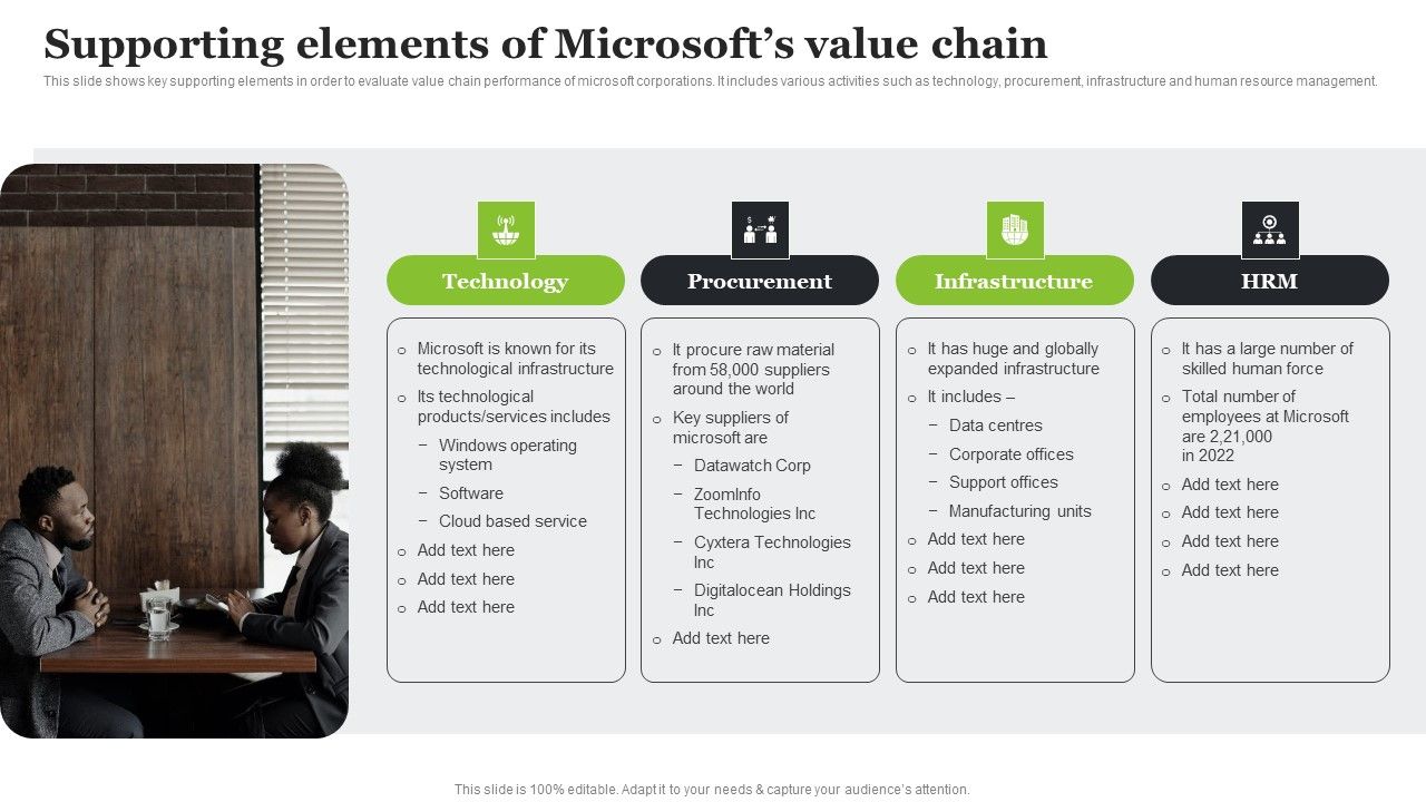 This slide shows key supporting elements in order to evaluate value chain performance of microsoft corporations. It includes various activities such as technology, procurement, infrastructure and human resource management. The best PPT templates are a great way to save time, energy, and resources. Slidegeeks have 100 percent editable powerpoint slides making them incredibly versatile. With these quality presentation templates, you can create a captivating and memorable presentation by combining visually appealing slides and effectively communicating your message. Download Microsoft Strategic Plan To Become Market Leader Supporting Elements Of Microsofts Value Chain Topics PDF from Slidegeeks and deliver a wonderful presentation.