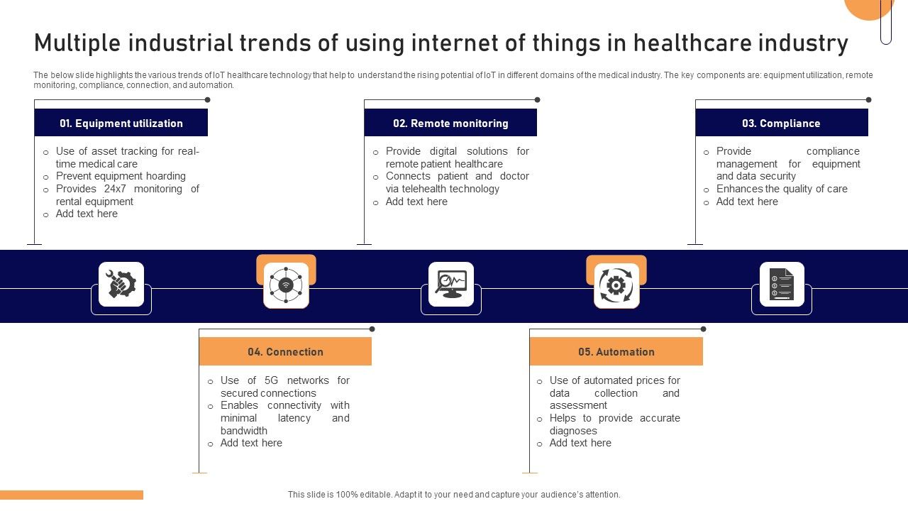 The below slide highlights the various trends of IoT healthcare technology that help to understand the rising potential of IoT in different domains of the medical industry. The key components are equipment utilization, remote monitoring, compliance, connection, and automation. Presenting Multiple Industrial Trends Of Using Internet Of Things In Healthcare Industry Clipart PDF to dispense important information. This template comprises five stages. It also presents valuable insights into the topics including Equipment Utilization, Remote Monitoring, Compliance, Connection, Automation. This is a completely customizable PowerPoint theme that can be put to use immediately. So, download it and address the topic impactfully.