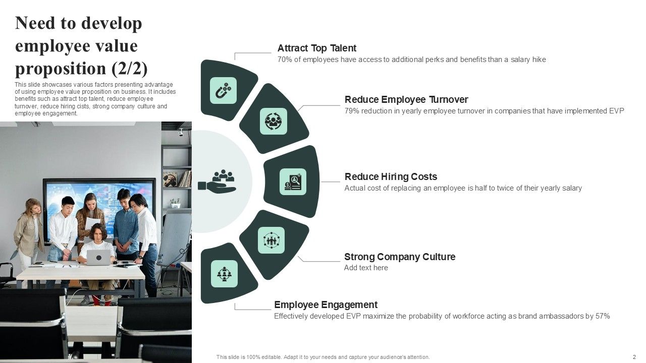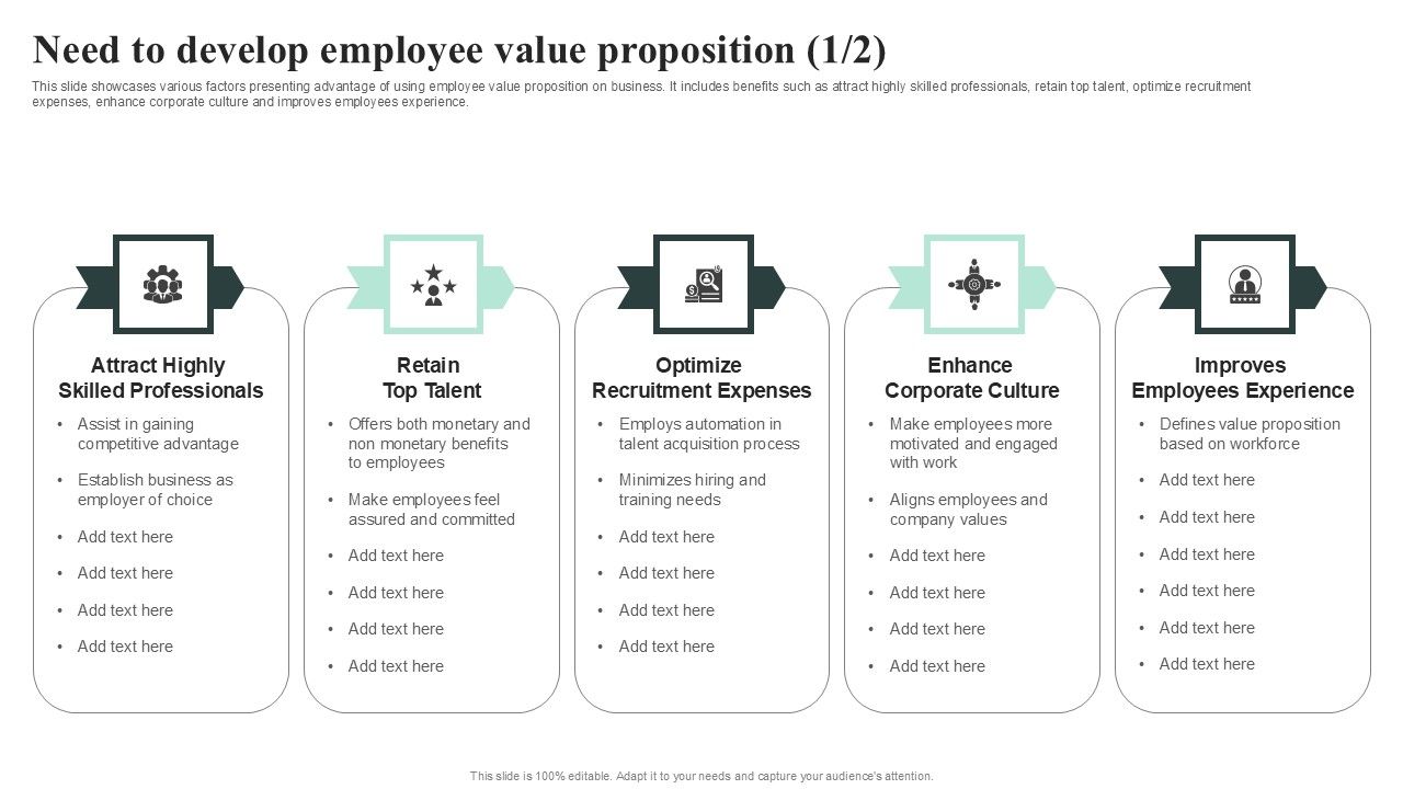 This slide showcases various factors presenting advantage of using employee value proposition on business. It includes benefits such as attract highly skilled professionals, retain top talent, optimize recruitment expenses, enhance corporate culture and improves employees experience. Slidegeeks has constructed Need To Develop Employee Value Proposition Structure PDF after conducting extensive research and examination. These presentation templates are constantly being generated and modified based on user preferences and critiques from editors. Here, you will find the most attractive templates for a range of purposes while taking into account ratings and remarks from users regarding the content. This is an excellent jumping off point to explore our content and will give new users an insight into our top notch PowerPoint Templates.