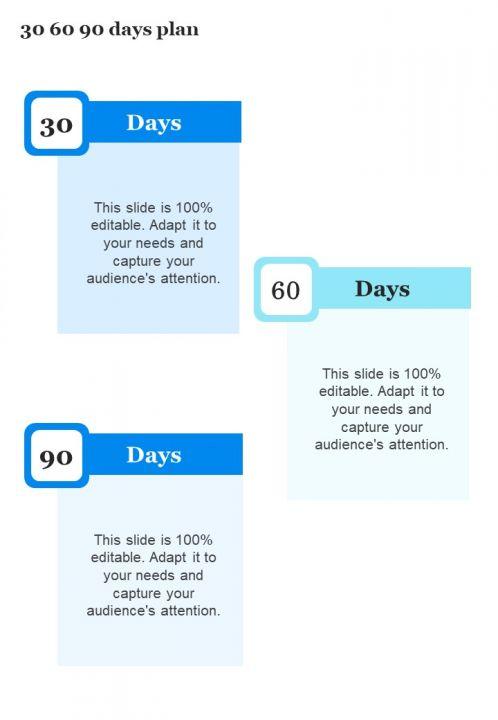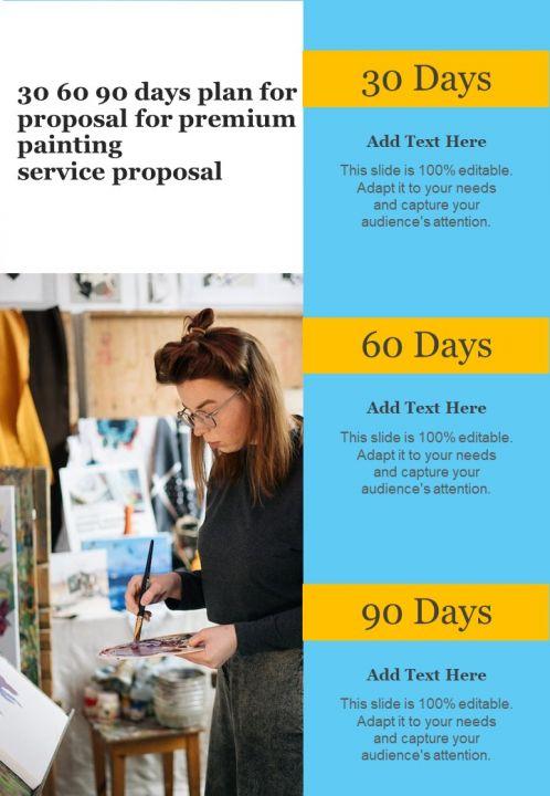 Presenting you an exemplary 30 60 90 Days Plan For Proposal For Premium Painting One Pager Sample Example Document. Our one-pager comprises all the must-have essentials of an inclusive document. You can edit it with ease, as its layout is completely editable. With such freedom, you can tweak its design and other elements to your requirements. Download this 30 60 90 Days Plan For Proposal For Premium Painting One Pager Sample Example Document brilliant piece now.