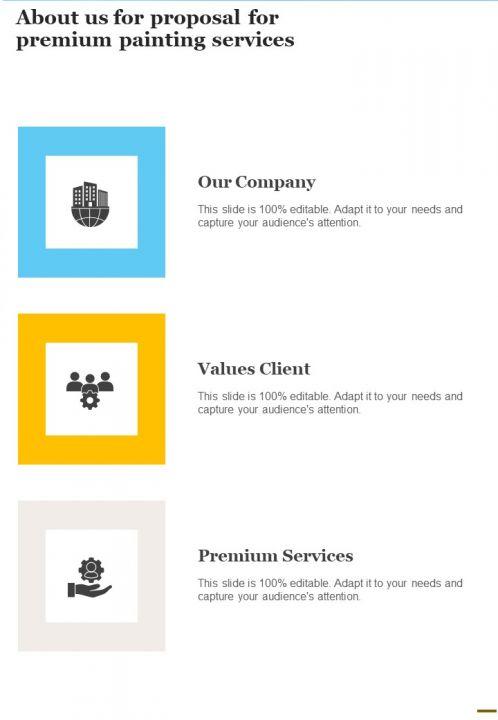 Presenting you an exemplary About Us For Proposal For Premium Painting Services One Pager Sample Example Document. Our one-pager comprises all the must-have essentials of an inclusive document. You can edit it with ease, as its layout is completely editable. With such freedom, you can tweak its design and other elements to your requirements. Download this About Us For Proposal For Premium Painting Services One Pager Sample Example Document brilliant piece now.