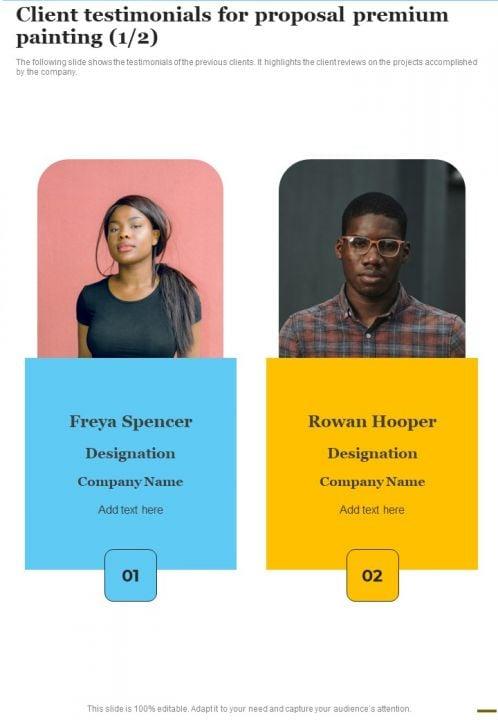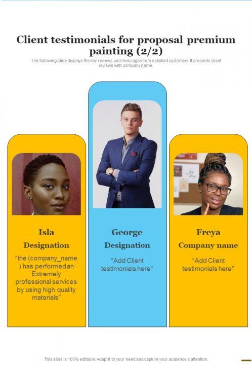 Presenting you an exemplary Client Testimonials For Proposal Premium Painting One Pager Sample Example Document. Our one-pager comprises all the must-have essentials of an inclusive document. You can edit it with ease, as its layout is completely editable. With such freedom, you can tweak its design and other elements to your requirements. Download this Client Testimonials For Proposal Premium Painting One Pager Sample Example Document brilliant piece now.