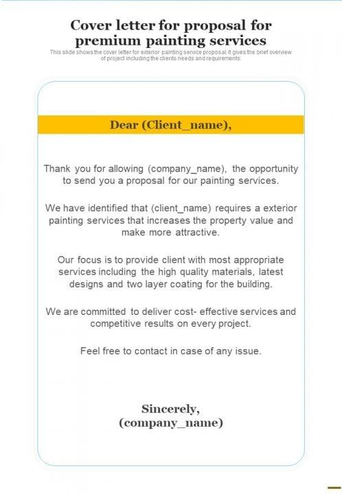 Presenting you an exemplary Cover Letter For Proposal For Premium Painting Services One Pager Sample Example Document. Our one-pager comprises all the must-have essentials of an inclusive document. You can edit it with ease, as its layout is completely editable. With such freedom, you can tweak its design and other elements to your requirements. Download this Cover Letter For Proposal For Premium Painting Services One Pager Sample Example Document brilliant piece now.