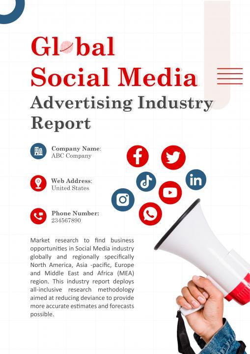This Global Social Media Advertising Industry Report Pdf Word Document is designed to help you retain your audiences attention. This content-ready PowerPoint Template enables you to take your audience on a journey and share information in a way that is easier to recall. It helps you highlight the crucial parts of your work so that the audience does not get saddled with information download. This sixty slide PPT Deck comes prepared with the graphs and charts you could need to showcase your information through visuals. You only need to enter your own data in them. Download this editable PowerPoint Theme and walk into that meeting with confidence.