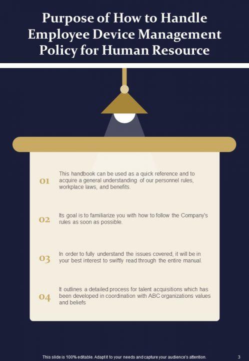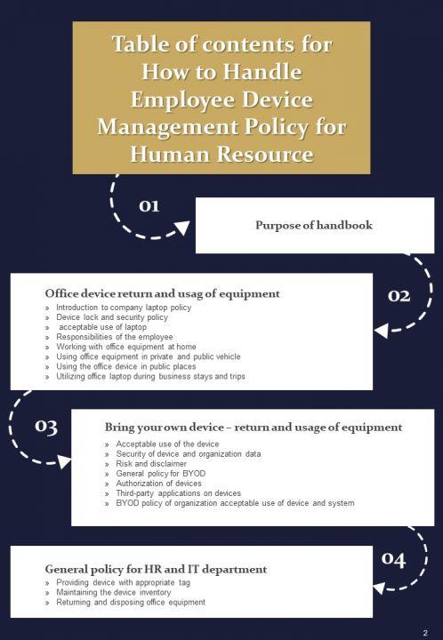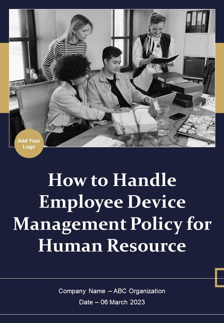 Introducing the How To Handle Employee Device Management Policy For Human Resource Handbook PPT Template, your shortcut to creating captivating handbooks. Impress your audience with visually-engaging content that is easy to customize. Our 100 percenteditable template saves you valuable time. Our team of experts has tailored the content to perfection. Grab your template now and effortlessly craft professional handbooks.